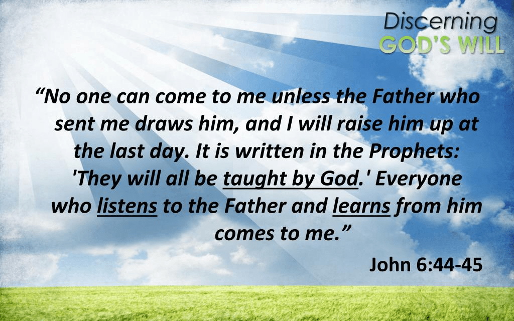 In verse 44, Jesus makes an important statement, “No one can come to Me, unless the Father who sent Me draws him/her.” This statement ties directly to the statement made earlier in verse 37, “All those whom the Father gives Me will come to Me” and again in verse 39, “…..of all He has given to Me, I should lose nothing”. No one comes to God unless He first draws the person to Him. We don’t come to Jesus on our own. We come because God draws or calls us. This does not mean that we are predestined or forced against our will. We have the free will to listen and answer the call. But if we never hear the voice of God, can we come to Him? I think not.