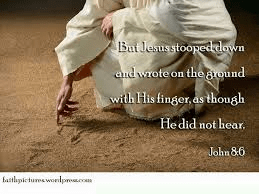 6 This they said, testing Him, that they might have something of which to accuse Him. But Jesus stooped down and wrote on the ground with His finger, as though He did not hear.