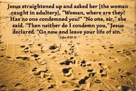 One by one, the adulterous woman’s accusers walked away after Jesus convicted their hearts of sin. They knew they hadn’t gone about this in the right way. They knew their motives were not pure. Their sin was just as bad as the woman’s sin that they had brought before Jesus. In verse 9, as the Pharisees and scribes walked away, Jesus was again bent over writing in the dirt. In verse 10, Jesus stood up and saw the woman alone, and asked her where her accusers were. “Has no one condemned you?” Jesus asked her. Jesus addressed her as “woman”, which was another word for “miss” or “ma’am” back during that time. If someone addressed us as “woman” today, we would probably take offense and think the person was being disrespectful, but that wasn’t the case back then. The woman replied, “No one, Lord.” And then Jesus says some powerful words that resonate with us today. I can picture Him saying this to me! Can you picture Him saying this to you? “Neither do I condemn you.” That, my sisters and friends, was/is hope…..for this woman…..for me…..for you, and for everyone! Jesus was God in the flesh. He had the power to forgive sins while He was on earth. This woman was guilty of sin, just as we all are. We know that God hates sin and cannot tolerate it. We know that there can be no sin in heaven. God would have no one in heaven with Him if He hadn’t sent Jesus to forgive our sins. Let that sink in. We are all in the same boat. Jesus is our Advocate…our Intercessor, who stands between God and us, and forgives us so that we will be acceptable to God. Jesus cleanses our filthy robes so that they will be white when we stand before God on judgment day. 1 John 2:1-2 says this, “My little children, these things I write to you, so that you may not sin. And if anyone sins, we have an Advocate with the Father, Jesus Christ the righteous. And He Himself is the propitiation for our sins, and not for ours only but also for the whole world.”